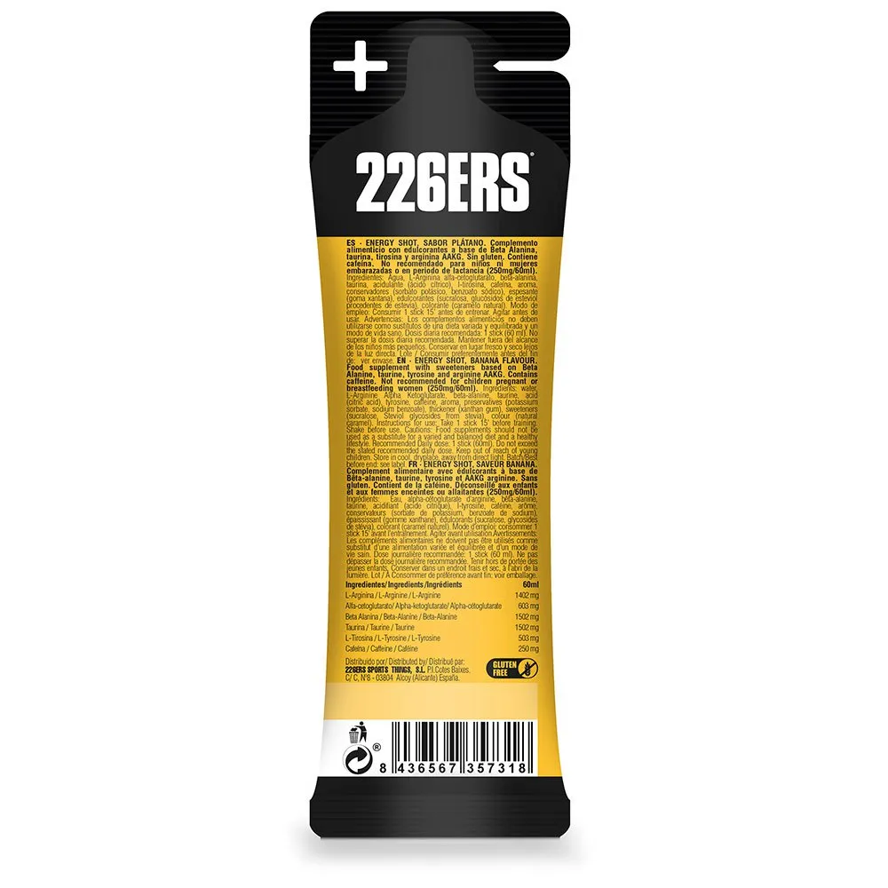 Energy shot es un producto con textura líquida de 60 ml, formulado con ingredientes específicos para mejorar el rendimiento del deportista y reducir la fatiga durante los entrenos y las competiciones.